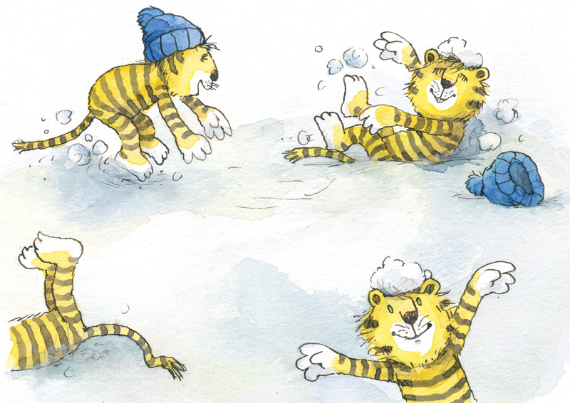 Mit einem Hasensprint rannte der kleine Tiger nach draußen. Sprang munter in den Schnee. Wälzte sich hin und her. Hüpfte hoch und runter. Kreuz und quer.