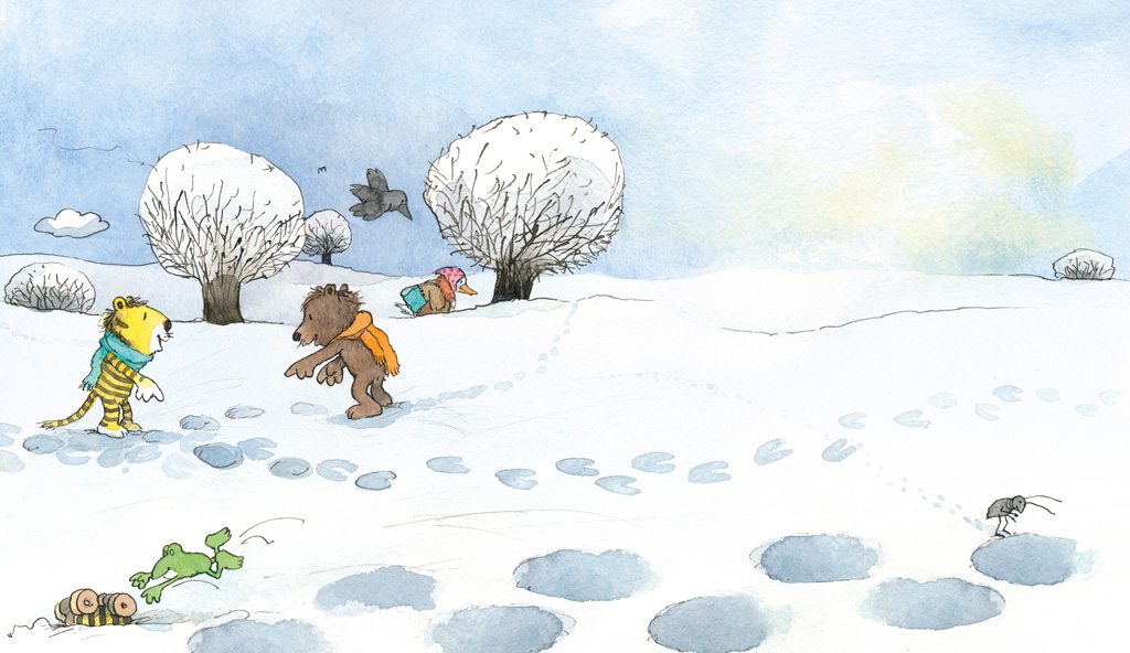 „Alles weiß!“ Der Schnee hatte auf das Haus vom Tiger und vom Bären, auf die Wiese und den Wald eine weiße Decke gelegt. Nur den Fluss kann der Schnee nicht zudecken. Der Fluss frisst die Schneeflocken ratzeputz.