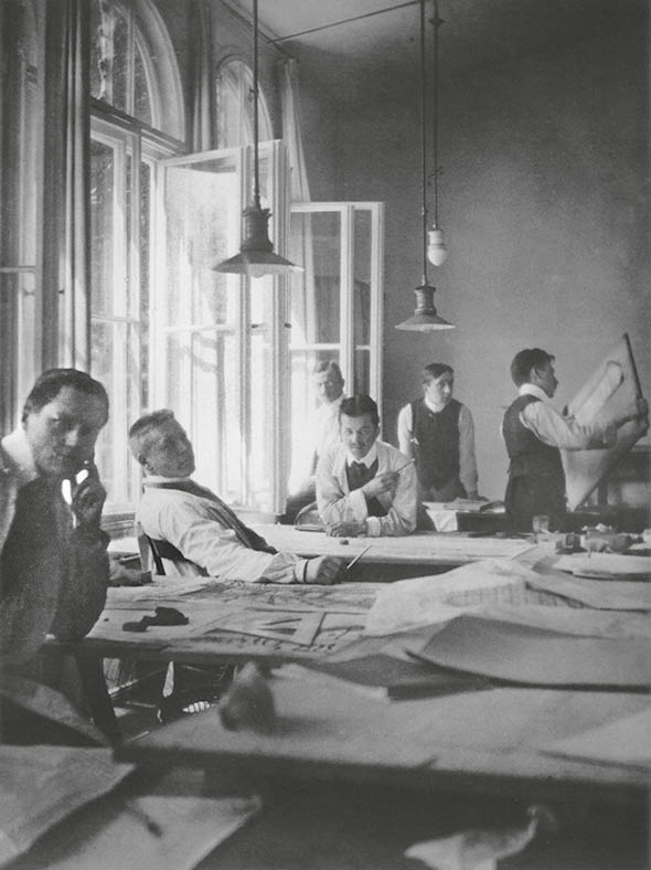 Mitarbeiter im Büro von Peter Behrens: Adolf Meyer (zweiter von links), ungesichert Mies van der Rohe (erster von links) und Walter Gropius (hinten rechts), um 1908