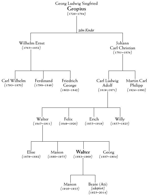 Gropius erklärte später, der Wunsch, Architektur zu studieren, sei bei ihm ganz selbstverständlich aus der Familientradition bis hin zum Beruf des Vaters erwachsen. Da aus der großbürgerlichen Berliner Familie Gropius im 19. Jahrhundert mehrere Architekten, Künstler und Unternehmer hervorgingen, die mit Karl Friedrich Schinkel in Verbindung standen, wurde der Name Gropius vielfach mit dem größten preußischen Baumeister assoziiert und war in Berlin und Preußen gut bekannt. Dieser familiäre Bezug zur Architektur und zu Schinkel, der angeblich in der Familie wie ein «Hausheiliger»[3] verehrt wurde, verschaffte dem Namen Gropius Renommee und dies war auch hilfreich für die Berufslaufbahn von Walter Gropius. Auf die Familientradition und die preußische Herkunft legte er deshalb auch zeitlebens großen Wert.