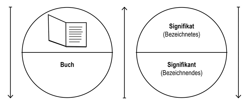 Ferdinand de Saussures Zeichenmodell. Ein sprachliches Zeichen besteht aus der arbiträren Verknüpfung von Signifikant (Ausdruck/Bezeichnendes) und Signifikat (Konzept/Bezeichnetes)