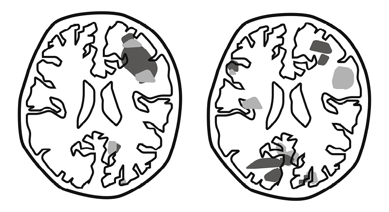 schematische CT-Aufnahme. Beim frühen Zweitsprachlernen (links) wird für beide Sprachen ein Gehirnareal aktiviert, während beim späten Lernen (rechts) mehrere Areale aktiviert werden (hell- bzw. dunkelgrau).