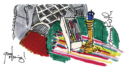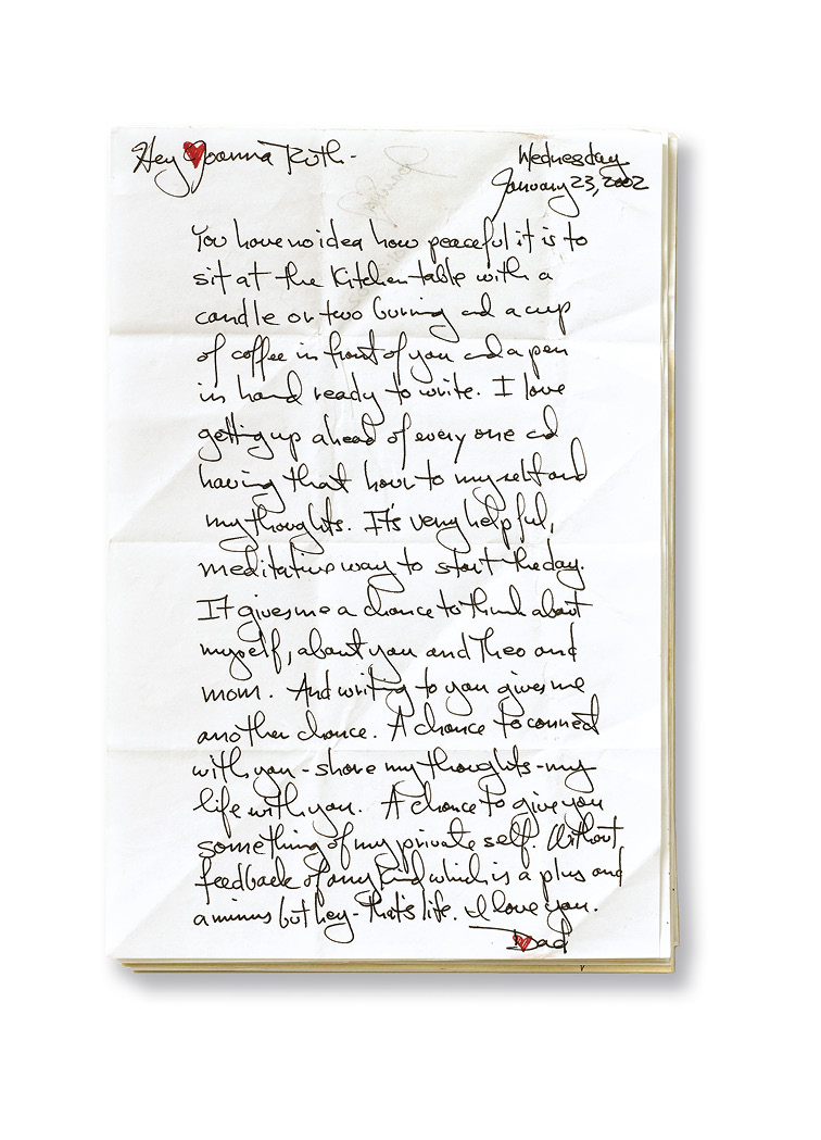 Was er schrieb, wandelte sich mit den Jahren – die Gewohnheit und die Adressaten änderten sich jedoch nie: Von 1995 an setzte er sich an jedem Schultag morgens hin und schrieb meinem jüngeren Bruder Theo und mir eine Nachricht, vierzehn Jahre lang, bis wir die Highschool abgeschlossen hatten. Er nahm sich einen Moment Zeit, um mit seinen Gedanken allein zu sein, bevor die tägliche Hektik begann. Er schrieb und er zeichnete und brachte etwas von sich selbst zu Papier, damit wir es mit in den Tag nahmen – jeden Tag.