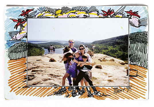 Bob, Gloria, Joanna, Theo und ihr Hund Sunny in Mount Desert Island, Maine. Handkolorierte Urlaubskarte 1998