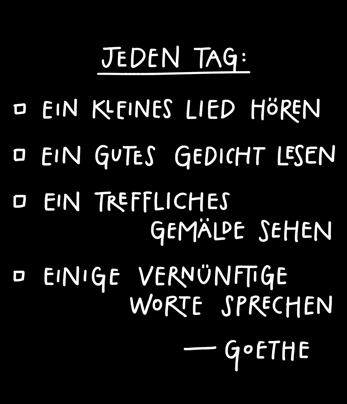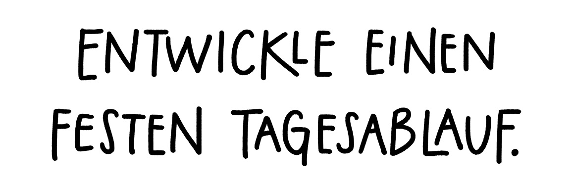 Ein fester Tagesablauf trägt einen durch den Tag und hilft, das Beste daraus zu machen. »Ein Tagesplan hilft, Chaos und wunderliche Einfälle einzudämmen«, schreibt Annie Dillard. »Er ist wie ein Netz, mit dem man den Tag einfängt.« Wenn man also nicht weiß, was man als Nächstes tun soll, wird es einem der Tagesplan sagen.