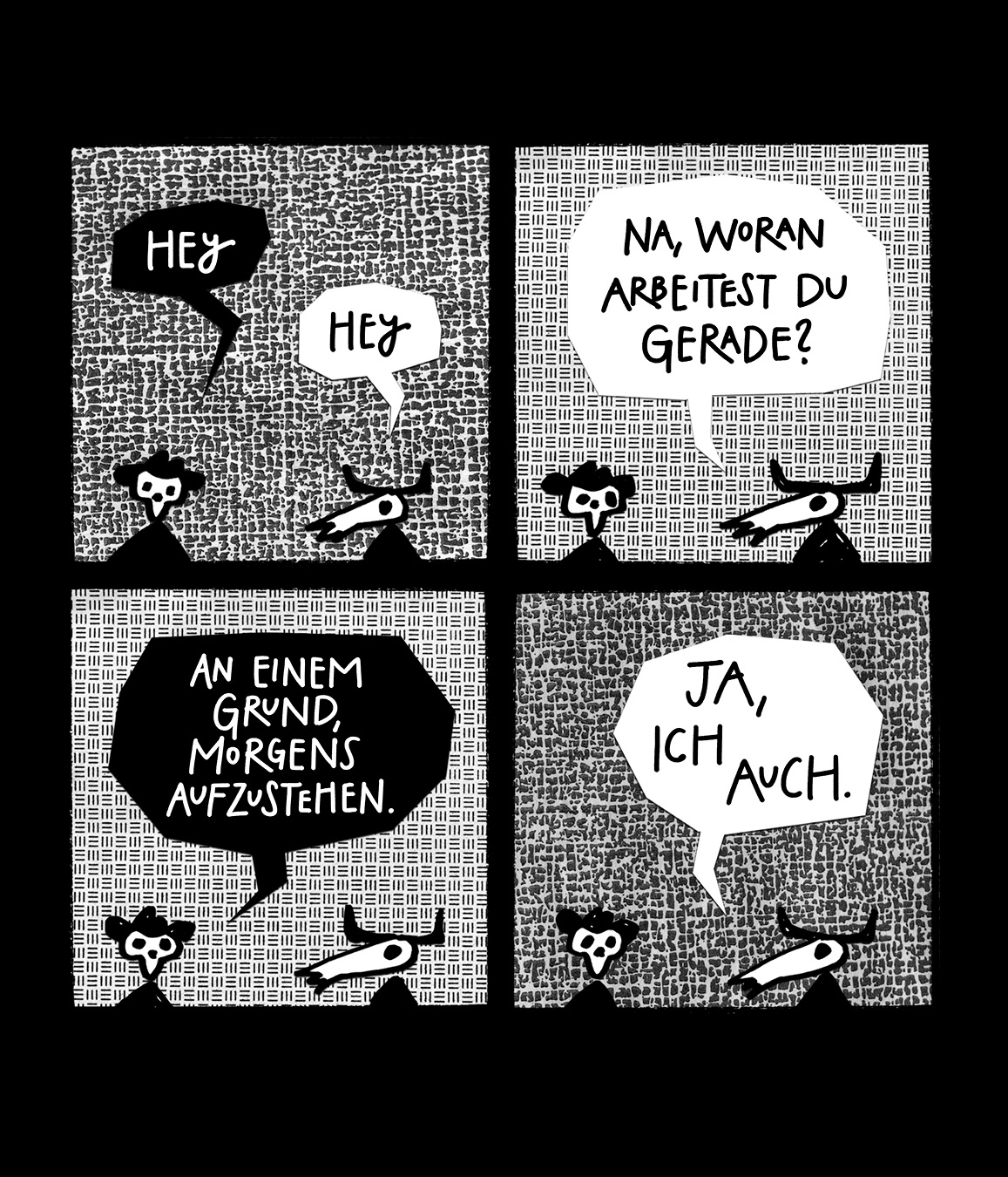 Wenn ich Kunst erschaffe, fühle ich mich nun mal nicht wie der reisende Held Odysseus. Eher wie Sisyphos, der seinen Felsbrocken den Berg hochwuchtet. Wenn ich arbeite, fühle ich mich auch nicht wie Luke Skywalker. Ich fühle mich eher wie Phil Connors aus dem Film Und täglich grüßt das Murmeltier.