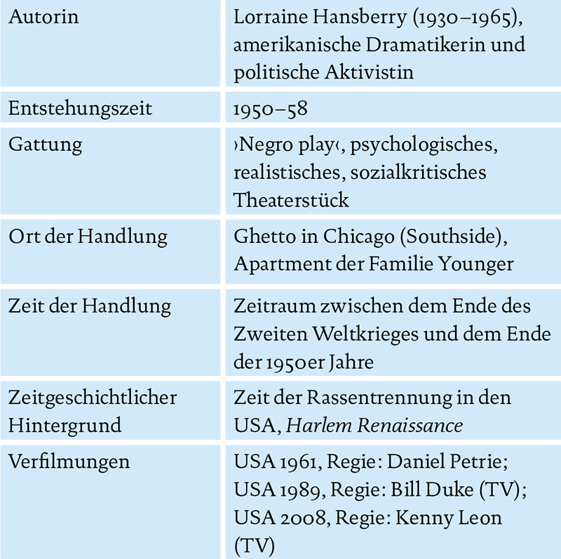 Auch wenn Familie Younger in ihren zwischenmenschlichen Konflikten besonders singulär erscheint, so repräsentiert ihre Art zu leben, ihre Erfahrungen, Hoffnungen und Enttäuschungen doch die große Mehrheit der Erfahrungen der afroamerikanischen Bevölkerungafroamerikanischen Familien der damaligen Zeit. Wenn man im 20. oder 21. Jahrhundert in Deutschland aufgewachsen ist, so kann man über die Lektüre von A Raisin in the Sun verstehen lernen, welch langen Weg Menschen mit dunkler Hautfarbe in den USA zu gehen hatten, um ihren heutigen Status zu erlangen.
