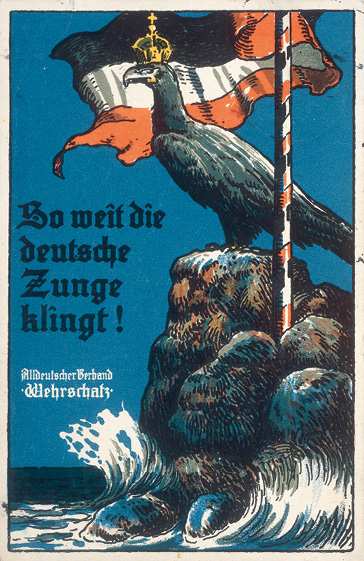 Organisationen wie der Alldeutsche Verband machten seit der zweiten Hälfte des 19. Jahrhunderts Vorstellungen von einem autoritären Staat stark, der Minderheiten entrechtet, ausgrenzt und nach neuem »Lebensraum« strebt. Postkarte von 1914.