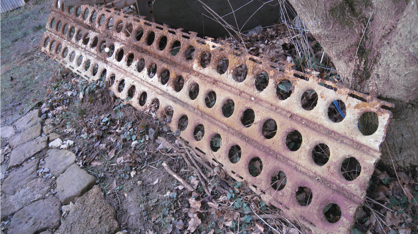 It glints dully on the side of a branch of cobbled pathway that passes through a gap in a straggly hedge. It is a strip of metal sheeting—laterally ribbed, punched with an even array of holes, a long piece of mattly rusted steel not quite flush with the ground so that a sort of malaise emanates from its patently temporary presence. It’s a metre-long length of so-called Marston Matting, or Perforated Steel Planking (PSP), which has migrated down the hill from the erstwhile French military training areas around the Wankheimer Täler, to the residual hippy trailer park that we call the Wagenburg—a now more-or-less permanent settlement of construction-workers’ caravans converted into a sort of a commune-cum-trailer park. This sheet of Marston Matting is probably of American origin. The stuff was first manufactured during the Second World War for use in the Pacific campaign and the invasion of continental Europe. The prefabricated matting was intended to provide an easily assembled road or runway surface to stabilize muddy or marshy ground. The individual elements were perforated to reduce weight, given lateral corrugations to stiffen them, and were equipped with a hook-and-slot system on opposite edges to allow each sheet to be connected to its neighbours. The modular units were designed to provide an artificial ground more permanent that the shifting soil they covered. But by the same token, they could be transported easily, laid quickly, and if necessary, ripped up equally rapidly to be rebuilt elsewhere.