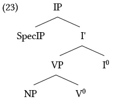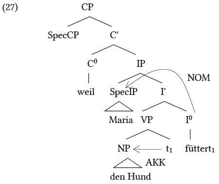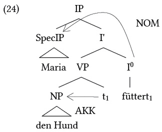 Man nimmt deshalb an, dass der Kasus eines Objekts vom Verb bestimmt wird, während das Subjekt seinen Kasus von den Finitheitsmerkmalen des finiten Verbs erhält. Für die Repräsentation eines Satzes nimmt man deshalb an, dass es oberhalb der VP eine IP (= Inflection PhraseInflection Phrase) gibt (vgl. (23)). Der Kopf dieser Phrase ist I0 und nimmt die VP als sein Komplement.