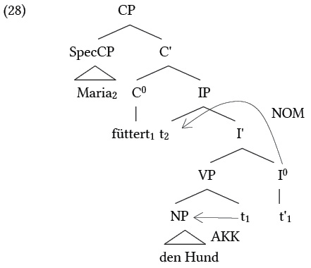 I0 beinhaltet kein lexikalisches Material, sondern die Merkmale für Person, Numerus, Tempus und Modus. Das Verb gelangt dieser Vorstellung nach als Verbstamm in die Struktur und erhält dort seine Finitheitsmerkmale, die in Form bestimmter Endungen realisiert werden. Das Verb muss sich von V0 zu I0 bewegen (wenn es finit ist), um diese Merkmale in I0 zu erhalten. Darüberhinaus weist I0 SpecIP den Nominativkasus zu, weshalb das Subjekt in genau dieser Position steht (vgl. (24)).