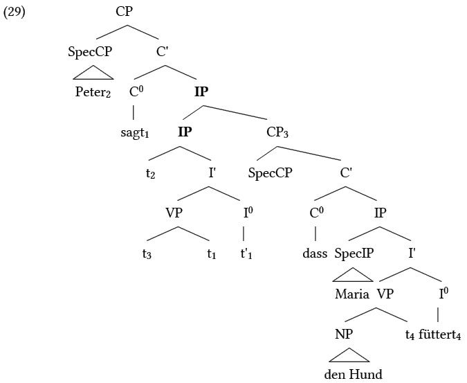 Wie aus (100) und (103) ersichtlich, steht die nicht von der Tilgung betroffene CP im Spezifikator der Koordinationsphrase. Die Struktur, die von der Tilgung betroffen ist, ist das Komplement des Kopfes:. In den Beispielen (111), (112) und (114) wird der Einfachheit halber nur abgebildet, zwischen welchen Teilsätzen die Koordinationsrelation bestehen kann.