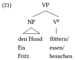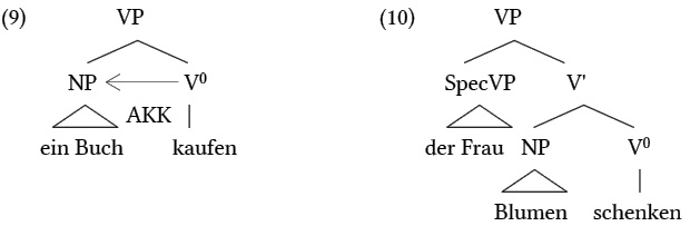 Mit diesem Strukturerzeugungsmechanismus lassen sich verschiedenste Arten von Phrasen generieren bzw. analysieren. In (8) liegen jeweils VerbalphrasenVerbalphrase (VPn) vor. Das Verb ist der Kopf der Phrase, es bestimmt über die Gestalt seines Komplements. Das Dreieck verwendet man in der Darstellung, wenn die interne Struktur der Phrase übergangen wird (vgl. z.B. (9) und (10)). Der Spezifikator der VP ist z.B. besetzt, wenn zwei Objekte beteiligt sind, wie in (10).