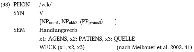 Die Kategorien N, A, V und P, die in (8) bis (19) vorkommen, sind lexikalische KategorienLexikalische Kategorie. Innerhalb einer Phrase stehen nur Einheiten, die zur ValenzstrukturValenzstruktur der lexikalischen Einheit gehören, d.h. die als syntaktische Mitspieler vom Kopf vorgegeben werden. Die Mitspieler sind die ArgumenteArgument einer lexikalischen Kategorie.