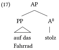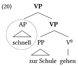 In (8a) hat kaufen z.B. eine Leerstelle für eine NP im Akkusativ (AKK), in (12) Tochter für eine NP im Genitiv (GEN), in (15) auf für eine NP im Dativ (DAT) und in (17) stolz eine für eine PP. Jegliche fakultative Angaben, die nicht vom Kopf gefordert sein können, sind nicht Teil der Phrase. Um auch adverbiale BestimmungenAdverbial wie schnell in schnell zur Schule gehen in der Struktur abzubilden, gibt es die Operation der AdjunktionAdjunktion. Dabei wird der Knoten einer XP verdoppelt, wodurch eine Position geschaffen wird: Da sich schnell in (20) auf die VP bezieht, wird in diesem Fall der VP-Knoten verdoppelt.