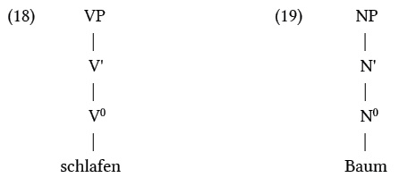 In allen Beispielen projiziertProjektion ein Kopf eine Phrase. Weitere Elemente, die vom Kopf gefordert werden, treten hinzu. Dabei muss ein Kopf keine derartigen Forderungen an Komplemente stellen. Er kann auch alleine eine Phrase aufspannen. (18) und (19) zeigen zwei Beispiele.