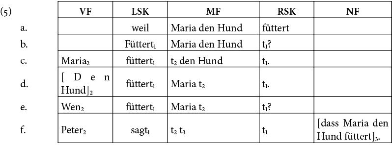 Durch die FinitumvoranstellungFinitumvoranstellung wird das finite Verb von der RSK in die LSK bewegt. Durch die Anwendung dieser Umstellung erhält man in der Regel einen selbständigen SatzSelbständiger Satz. Sie erfolgt in (4)/(5) deshalb in (b) bis (f). Wird eine Konstituente umgestellt, hinterlässt sie in ihrer UrsprungspositionUrsprungsposition eine Spur (t für Englisch trace). Die Indizes zeigen uns, welche Spur zu welcher Konstituente gehört. Bei der TopikalisierungTopikalisierung wird eine Konstituente aus dem MF ins VF umgestellt. Dies ist der Fall in (c) bis (f). In (e) wird die vorangestellte Phrase zuvor noch w-pronominalisiert, d.h. durch ein w-Pronomenw-Pronomen ersetzt. Man spricht deshalb auch von w-Bewegungw-Bewegung. Bei der ExtrapositionExtraposition wird eine satzwertige oder nicht-satzwertige ,schwere‘ Konstituente ins NF versetzt, wie z.B. in (f). Die abgeleitete Struktur, d.h. die Struktur, die nach den Umstellungen vorliegt, ist die sogenannte OberflächenstrukturOberflächenstruktur.