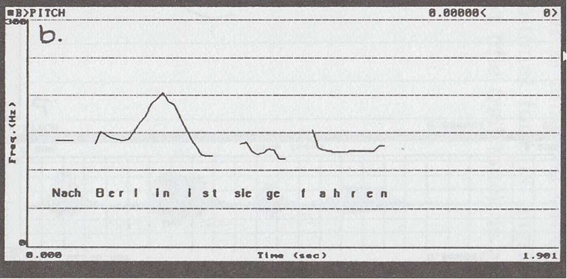 In Abbildung 1 sieht man, dass die zweite Silbe von Berlin einen TonhöhenakzentTonhöhenakzent erhält. Auf der x-Achse ist die Zeit aufgetragen, auf der y-Achse die Frequenz.