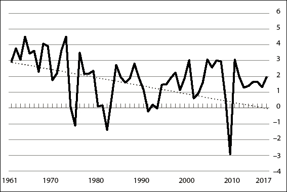 An dieser Kurve lässt sich ablesen, wie eine Welt nachlassender wirtschaftlicher Dynamik aussieht: