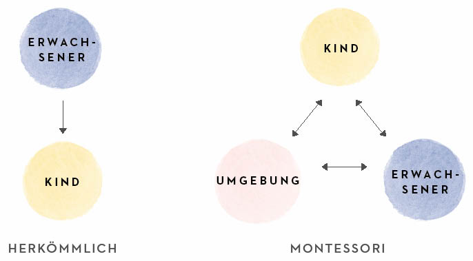 Bei der Montessori-Pädagogik besteht eine dynamische Beziehung zwischen dem Kind, dem Erwachsenen und der Lernumgebung. Das Kind entwickelt sein eigenes Lernen und wird dabei vom Erwachsenen und von der Umgebung unterstützt.