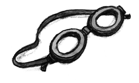 Der Schwimmbrillenmann kramt in seinen Jackentaschen und zieht sie daraus hervor. Er setzt sie auf.