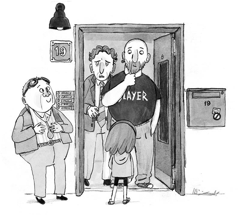 Der Schwimmbrillenmann zieht mich am Ärmel hinter sich her zum Haus. Er will mir etwas auf dem Klingelschild zeigen.
