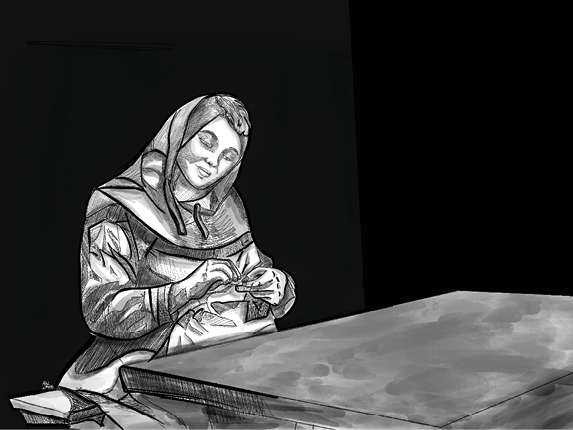 Über den Sommer wuchs ihr Bauch. Liebe sollte kostbare Früchte tragen. Die Königskinder liebten sich am Tage, liebten sich in der Nacht. Die Frau spürte die Not der Welt. Ihre Tücher sollten die blutende Gesellschaft vor der drohenden Katastrophe bewahren. Als sie sich von dem Ritter am Markttag verabschiedete, legte er ihr beschützend seine Arme um den Bauch. Er nahm ein Tuch vom Wagen, um ihr Kind zu verbergen. Das Lied des Tuches handelte von der Sehnsucht nach Frieden. Auf dem Markt trat der Pfarrer des Dorfes an ihren Stand. Ihm wären die besonderen Tücher zu Ohren gekommen, man munkelte, dass in ihnen Magie steckte. Er prüfte die Fäden, konnte nichts Verwerfliches erkennen. Mit scharfem Blick musterte er die junge Frau. Eine Ahnung huschte über sein Gesicht. Schnell verbarg er seine Gedanken. Das Heer der Kirche stand bewaffnet hinter jeder Tür.