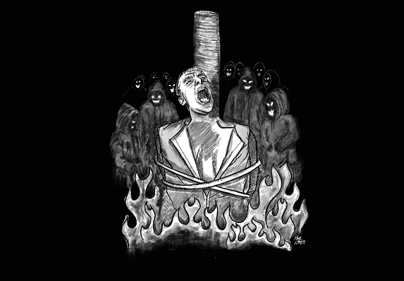 Der Ritter wollte sofort los, doch sie brach in Tränen aus, brach zusammen. Dieser Ort war ihr Ein und Alles, die Schwangerschaft zu weit fortgeschritten für eine Flucht. Sie betete zu den Göttern, möge ihr Schutz die letzte wahre Liebe verbergen. Der Tag der dunklen Mächte war gekommen. Ein Zug aus Menschen mit Fackeln, angeführt vom Pfarrer, drang in ihr kleines Reich ein. Der Ritter suchte vergeblich nach seinem Schwert. Sie hatte es versteckt. Er war jeder Waffe für den letzten Kampf beraubt, und doch stellte er sich schützend vor sie, bereit, seine Familie bis auf den Tod zu verteidigen. Aus einem Hinterhalt traf ihn ein Pfeil in den Bauch. Er ging zu Boden. Fünf Männer griffen ihn, fesselten ihn an Armen und Beinen. Warfen ihn auf einen Wagen. Zwei weitere packten die junge Frau, schmissen sie gefesselt neben ihn. Sie schrie auf vor Schmerz. Ihre Bauchdecke wurde hart. Der Weg ins Dorf glich einer Tortur. Sie sang ein Lied zur Beruhigung für ihre ungeborene Leibesfrucht. Der Ritter blickte sie aus flehenden Augen an. Es war zu spät. Keiner würde zu Hilfe eilen. Das Urteil war gesprochen. Die Hexe, welche mit dem Teufel das Bett teilte, seine Brut in sich trug, musste sterben. Der Pfarrer schürte die Hetze. Der dunkle Mob erreichte das Dorf. Ein kurzer Prozess blitzte in todeshungrigen Augen. Sie zerrten die Frau unter den Schreien des Ritters zum alten Brunnen. Wir, die Kirche, verurteilen die hier anwesende Frau zum Tode, wegen Hexerei und dem Beischlaf mit dem Teufel. Sie hat unser Dorf vergiftet und sich feige in den Wäldern verschanzt. Die Kirche bestraft solch Frevel mit dem Tod. Die Frau flehte unter Tränen, man solle sie noch ein paar Wochen am Leben lassen. Ihr Kind solle das Licht der Welt erblicken. Nehmt mich, doch nicht das Leben dieses unschuldigen Wesens. Der Pfarrer hieß sie zu schweigen. Der Henker riss sie an den Haaren hoch, legte sie auf den Rand des Brunnens. Der Ritter schrie um Gnade, wollte sich an ihrer Stelle in die Tiefe werfen lassen. Für einen Wimpernschlag stand die Zeit still. Du, meine große Liebe. Kein Staat, keine Kirche dieser Welt kann mir dich nehmen. Die Meere werden toben, Sterne werden untergehen. Ich fange sie auf für dich, um dem Höllenhund ein Stück des kosmischen Lichtes zu schenken. Die Kreise der Magie werden uns leiten zum Neuanfang dieser Welt. Kalte Kriege werden über die eifersüchtige Menschheit herrschen. Die Frucht ihres Hasses wird alles verpesten. Ich verfluche die Ohnmacht dieses Reiches, auf dem Weg in seinen Untergang. Kein Schmerz dieser Welt wirkt so stark wie der Zauber unseres Glaubens. Der Glaube an die Wahrheit. Die Liebe wird nicht unter einem Kreuz geboren, sie wächst Wildblumen gleich am Wegesrand. Egal, welche Abgründe an dir zerren, ich werde vor dir dort sein. Deinen Weg werde ich ebnen. Dornen pflücken, damit mein Kind sich seine Füße nicht blutig läuft. Ewig werde ich meine Kriege für deine Rache niederlegen. Es braucht keine Schwerter. Es braucht uns, damit die Achtsamkeit unter den alten Sternen wiederaufersteht. Stelle die Dämonen an deine kalte Hand und folge meiner Liebe, hinab ins Hinterland.