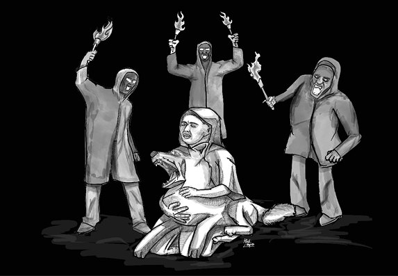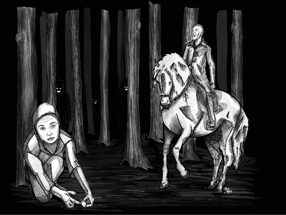 Eines Morgens kam ein Reiter zu ihrem Hof, brachte schlechte Kunde. Es ging das Gerücht, dass einer der letzten Ritter im Wald verschollen war. Die Bewohner kamen schnell zu dem Entschluss, dass er bei der Hexe unsittlichen Unterschlupf gefunden habe. Das Dorf hatte sie zur Hexe auserkoren. Der Ruf, den die große Macht der Tücher genoss, drang bis zur Kirche vor. Die Frauen begannen sich zu regen, Treffen des heimlichen Widerstands. Eine Frau hatte in der Beichte darum ersucht, ihren Tyrannen verlassen zu dürfen. Der Reiter bemerkte erschrocken die Rundung ihres Bauches und riet, noch in der gleichen Nacht zu fliehen. Die Menschen hatten keine Angst mehr vor dem Wald. Der Wolf war schließlich tot. Sie würden kommen, um die beiden zu holen.
