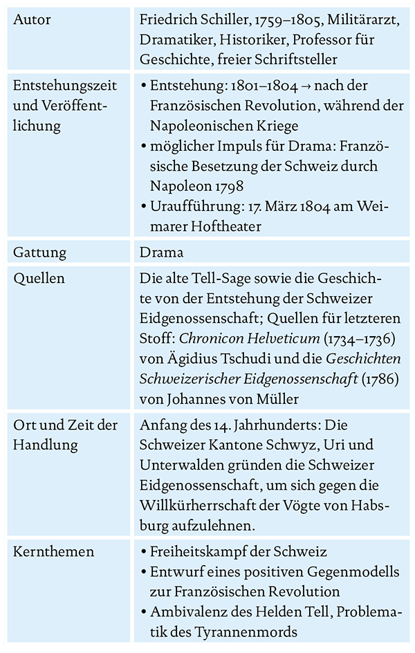 Ort und Zeit der Handlung | Anfang des 14. Jahrhunderts: Die Schweizer Kantone Schwyz, Uri und Unterwalden gründen die Schweizer Eidgenossenschaft, um sich gegen die Willkürherrschaft der Vögte von Habsburg aufzulehnen. |