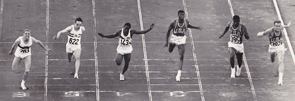 100-m-Finale, Rom 1960. Links außen: Armin Hary (BRD). Rechts außen wirft sich Dave Sime (USA) über die Ziellinie.