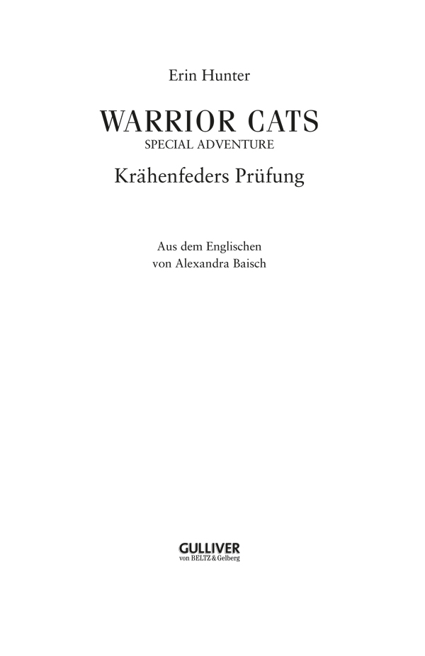 »Das werde ich auch nicht«, antwortete Krähenfeder. Am Ufer des Flusses blieb er stehen, drückte sich an Blattsee und sog ihren Duft ein letztes Mal mit offenem Kiefer tief in sich ein. Sie wird mir unglaublich fehlen, dachte er. Ihre Sanftheit, ihre Stärke, ihr Mut. Und wie wir zusammen gespielt haben, als wären wir nicht älter als Katzenjunge …
