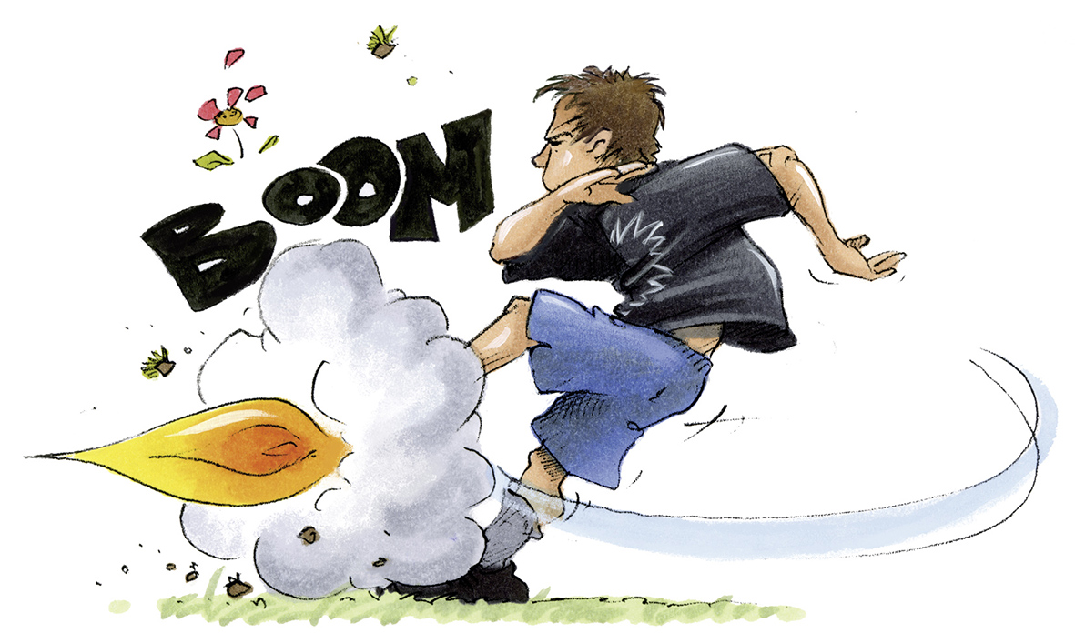 Trotzdem hängte sich Juli »Huckleberry« Fort Knox an die Fersen von Leroy Sane. Er grätschte im allerletzten Moment, um das Tor zu verhindern. Er grätschte und rutschte direkt in die Beine seiner Mutter hinein, die urplötzlich mit dem Abendbrot in der Zimmertür stand. Der Fasanengarten erbebte, jetzt schon zum zweiten Mal, und das Nutellabrot flog durch die Luft in Joschkas Gesicht, Julis kleinerem Bruder, in den sich Leroy Sane plötzlich zurückverwandelt hatte.