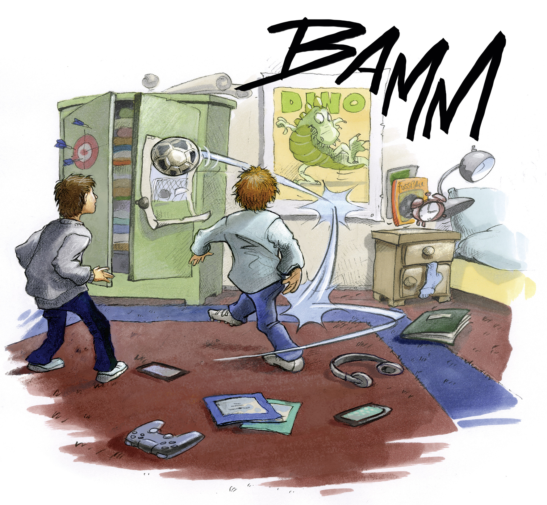 Im Fasanengarten Nr. 4, bei meinem besten Freund Fabi, passierte das Gleiche. Auch er drosch den Ball gegen die Wand seines Zimmers. BAMM! Und Juli zusammen mit Joschka, seinem kleineren Bruder, im Haus schräg gegenüber: BAMM! BAMM! Doch zwei Straßen weiter, in der piekfeinen Alten Allee Nr. 1 konnte Maxi nicht in sein Zimmer. Da stand das Barbiepuppenhaus seiner jüngeren Schwester. Also donnerte er den Ball gegen die Wohnzimmerwand: BAMM! Immer genau zwischen Spiegel und Glasvitrine: BAMM! Das war sein Tor.