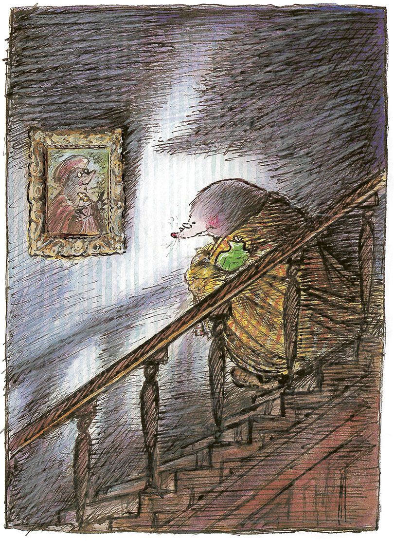 Maus lief ins Wohnzimmer und heizte ein Apfelholzfeuer an. Der duftende Apfelholzrauch zog durchs Haus, und kurz darauf schlurfte Maulwurf auch schon die Treppe hinunter.
