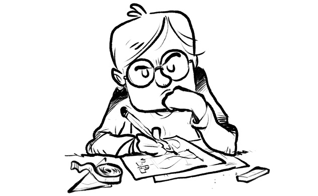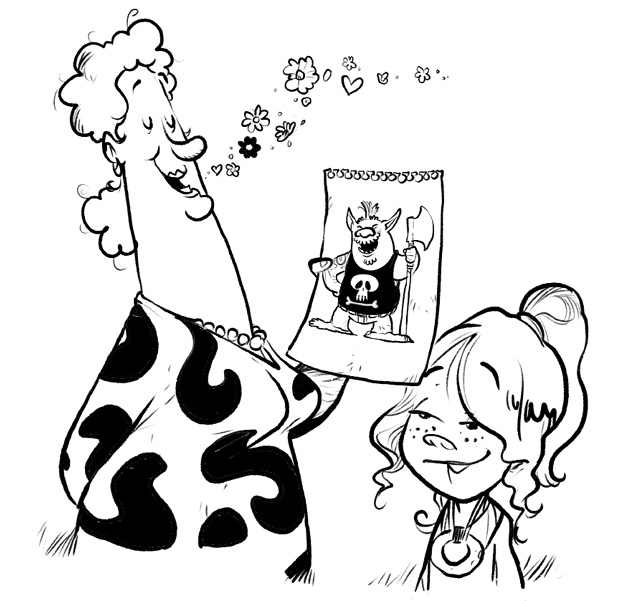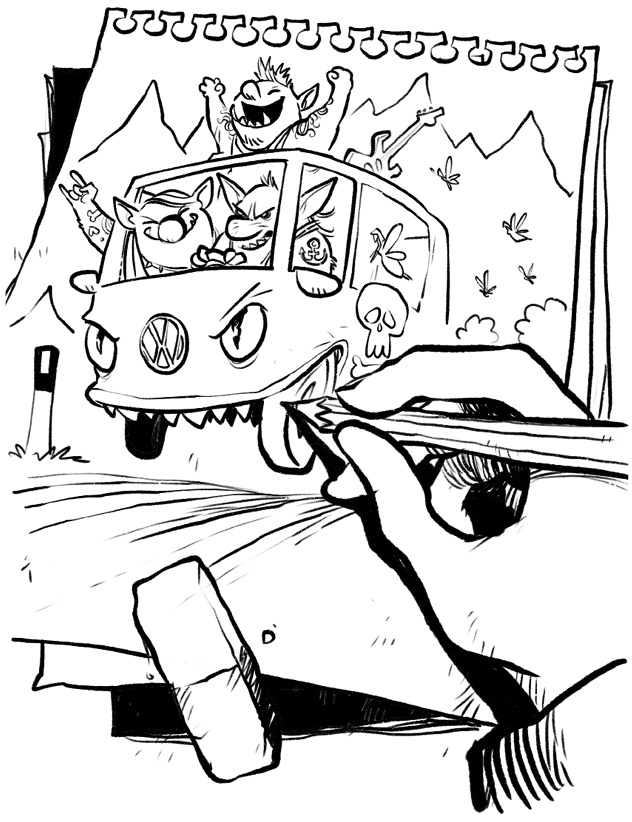 Aus dem Augenwinkel sah ich, dass auf Lenas Bild drei dicke Trolle mit Tätowierungen und Heavy-Metal-T-Shirts in einem VW-Bus über eine Berglandschaft dem Sonnenuntergang entgegenfetzten. Abgesehen davon, dass sie echt gut zeichnen konnte, dachte ich nur: Oh nein, jetzt sitze ich auch noch neben der Klassenwahnsinnigen!