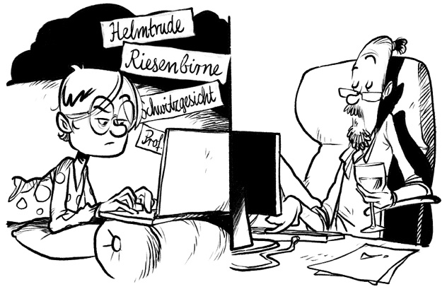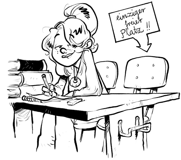 Moment, eigentlich will ich doch meckern: Nach meinem Marsmännchenauftritt am ersten Tag war ich ja auch ein totaler Außenseiter – aber das war der feinen Frau Schnacke anscheinend egal! Lieber etwas für die arme, arme Koboldin tun, dachte sie wohl. Dem bebrillten Marsjungen wird in seinem Riesenschädel bestimmt selbst eine Lösung für seine Probleme einfallen.