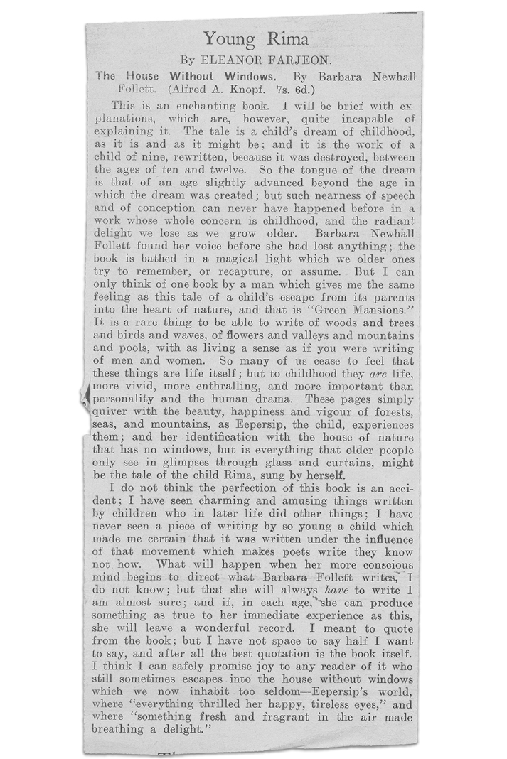 Auf Die Welt ohne Fenster stieß ich zum ersten Mal durch eine Rezension der preisgekrönten Autorin Eleanor Farjeon, die es als ein »kleines Wunder« bezeichnete. Farjeon fragte sich, was dieses kleine Mädchen als reife Autorin hervorbringen würde, und freute sich auf zukünftige Arbeiten von Barbara, denn »sie wird sicherlich auch in Zukunft schreiben«. Es gelang mir, ein Exemplar von Die Welt ohne Fenster zu ergattern – abgenutzt und oft gelesen, mit wundervollem Papier und Büttenrand – und ich verliebte mich sofort.