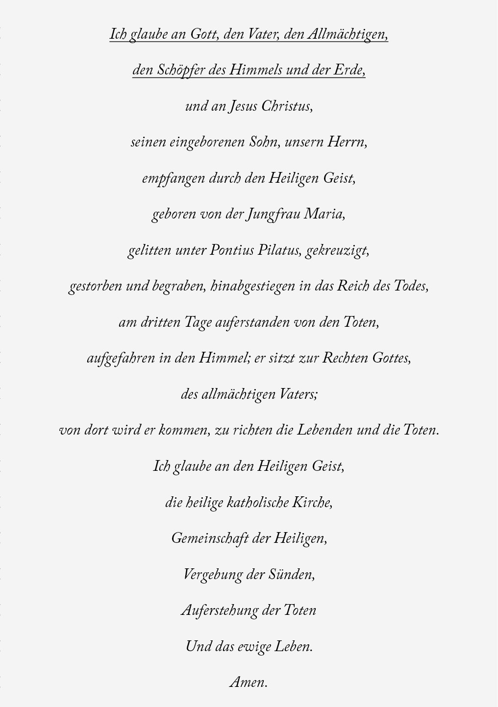 Die Version des Glaubensbekenntnisses, welche das Gespräch zwischen Papst Franziskus und Marco Pozza zum Gegenstand hat, ist das Apostolische Glaubensbekenntnis (auch das »Kleine Glaubensbekenntnis« genannt). Im Vergleich zum Nizäno-Konstantinopolitanischen Glaubensbekenntnis (auch das »Große Glaubensbekenntnis«), das meist bei feierlichen Anlässen in der Kirche gesprochen wird, ist das Apostolische Glaubensbekenntnis – das zur sonntäglichen Messe gehört – älter.