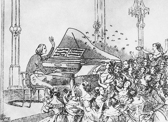 Liszt spielt vor einer hingerissenen Menge in Berlin; die Szene erinnert an ein modernes Rockkonzert. Zeichnung aus dem Jahr 1842.