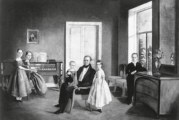 Eine russische Familie mit ihrem Instrument in den 1840er Jahren, als Klaviere wichtige Prestigeobjekte wurden.