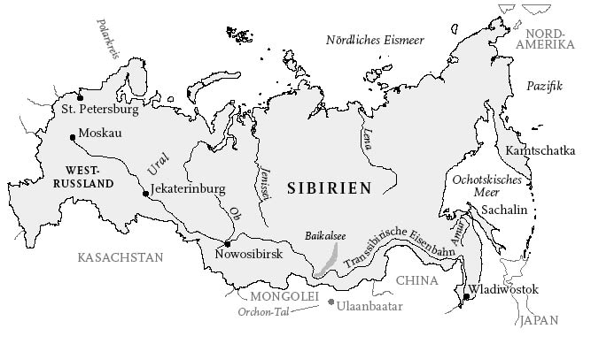 Sibirien, das ein Elftel der Landmasse der Erde bedeckt, wird im Norden vom Nördlichen Eismeer und im Süden von der mongolischen Steppe begrenzt. Der Ural markiert die Westgrenze, der Pazifik die östliche. Es ist das ultimative Land jenseits des »Großen Steins«, wie man den Ural früher genannt hat, ein ungeschriebenes Register der Vermissten und der Entwurzelten, ein Beinahe-Land, in der Wahrnehmung so weit weg von Moskau, dass sich sogar noch nach 1908, als im berühmten »Tunguska-Ereignis« eine Art herabstürzender Stern eine Waldfläche von der doppelten Größe der russischen Hauptstadt zerstörte, zwanzig Jahre lang niemand die Mühe einer Nachforschung machte. Bevor Flugreisen die Entfernungen verkürzten, war Sibirien zu entlegen, als dass irgendjemand Nachschau gehalten hätte.