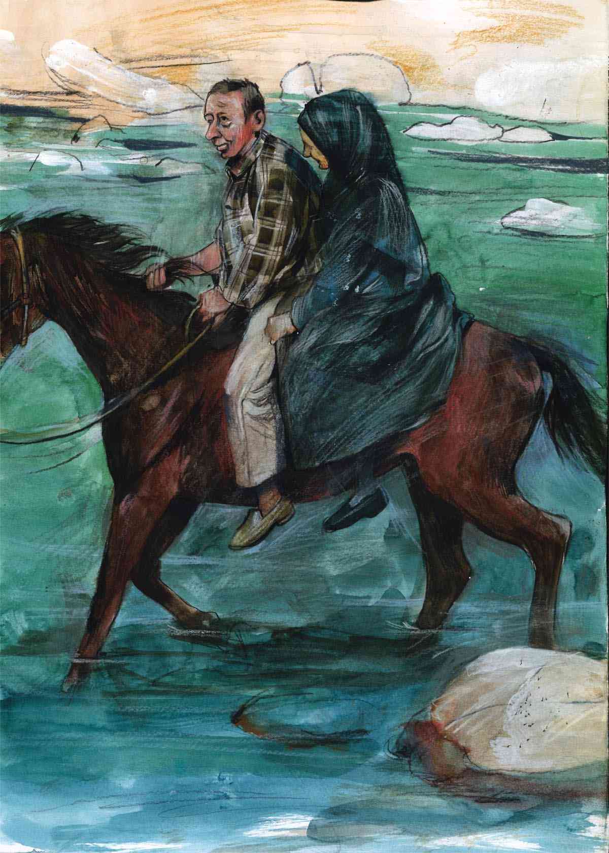 Peronnik ritt herzu, ließ sie hinten aufsitzen und begann die Furt zu durchreiten. Mitten im Fluss sagte die Dame zu ihm: »Weißt du auch, wer ich bin, du armer Junge?«