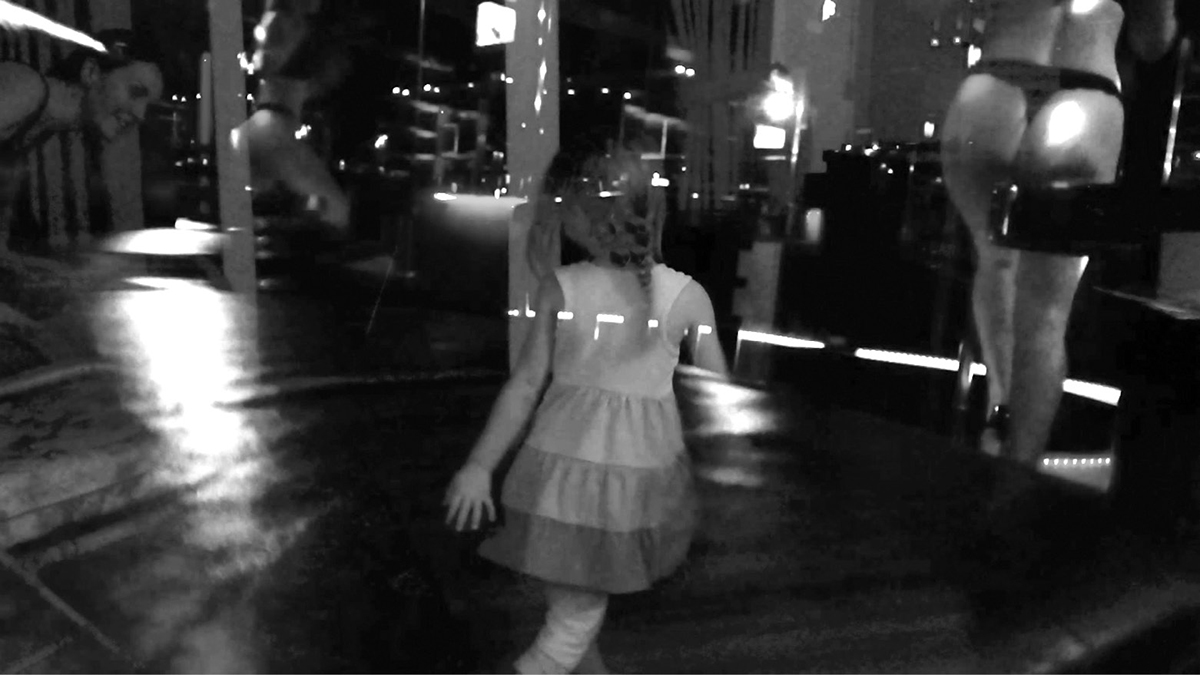 My career in adult entertainment (as a dancer) has tended to stand in direct contrast to my life as a mother. Proceeding through auto-ethnographic and sex-positive feminist frameworks, I have attempted to explore and reconcile my experiences of this binary through an arts-based research practice. Following on from the work of early mother-artist Mary Kelly, I collected video material of myself and my daughter over the course of about three years, filming at home and at work. I approached this as data collection, utilising a variety of camera angles and cinematographic techniques and becoming more reflexive as time went on. Very simple editing techniques such as overlays and time distortion were used to combine and overlap the footage, so as to emphasize the liminal and ambiguous aspects of the imagery. The final work, from which this still is taken, is a kind of extended dreamlike sequence intended for a large-scale, single channel projection. By disrupting the representation of time and space, my aim was to also disrupt assumptions and stereotypes relating to my work as an adult-entertainer, not to mention the “semiotic taboo” of motherhood, which is discussed at len-gth by Andrea Liss in her 2009 publication Feminist Art and the Maternal (1-21).