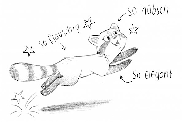 Sie konnte nämlich lesen. Wirklich! Das hatte sie sich selbst beigebracht, weil ihr so entsetzlich langweilig in dem Wohnzimmer war. Vom Käfig aus kletterte sie am Bücherregal hoch, denn Katzenbären sind sehr gute Kletterer.