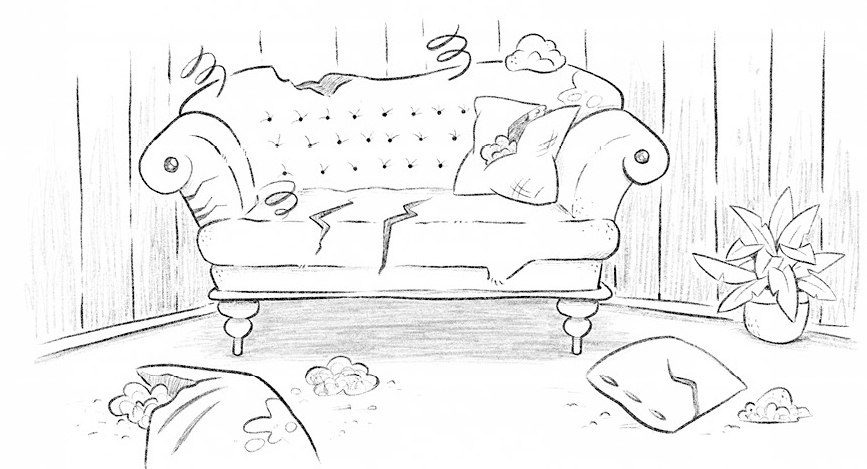 Weiter kam sie nicht. Was war denn hier los? Die Spitzengardine hing zerrissen herunter. Die große Vase lag in Scherben auf dem Boden. Auch die Kissen und Deckchen lagen unten. Aber das Schlimmste … ja, das Schlimmste war wohl das gute Sofa. Lange Risse gingen durch den Bezug, und die weiße, flauschige Füllung kam hervor. Das Wohnzimmer sah richtig verwüstet aus.