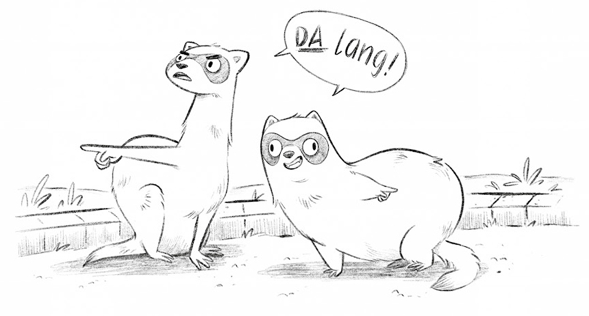 Flopson drehte sich um. Direkt hinter ihr standen zwei ziemlich zerzauste Frettchen. Sie waren die ersten echten Tiere, die sie in ihrem ganzen Leben traf. Abgesehen von Tjalle natürlich. Deshalb freute sie sich sehr, die beiden kennenzulernen. »Hallo! Ich bin Flopson«, sagte sie. »Und wer seid ihr?«