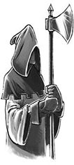 Der Maskenmann lachte wild über all die Furcht und den Schrecken, die er verbreitete. Winkiesoldaten holten die königlichen Herrschaften unsanft aus dem Karren und schubsten sie die Stufen zur Plattform hinauf. Anschließend positionierten sie sich als Wächter entlang der Seiten der Bühne. Der Henker im langen Umhang schärfte seine Axt und wartete auf den Befehl, sein Handwerk zu verrichten.