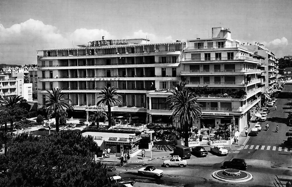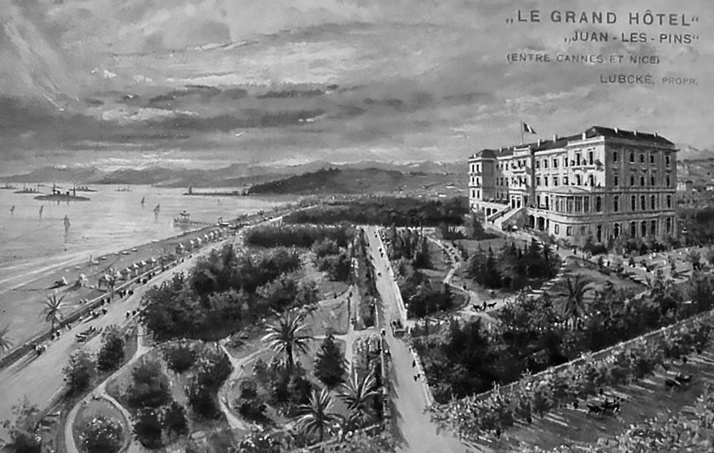 Das alte Grand Hotel von Juan-les-Pins aus den 1890er Jahren (oben) warb vorausschauend damit, dass es auch im Sommer geöffnet sei, als an der Côte noch die Wintersaison dominierte. Die verarmte Isadora Duncan residierte hier 1927 kurz vor ihrem spektakulären Tod an der Prom in Nizza, als sie in den Amilcar des Rennfahrers und Garagisten Benoît Falchetto stieg, sich ihr langer chinesischer Seidenschal in der Hinterachse verfing und ihr Genick gebrochen wurde. Nach 1945 wurde der ursprüngliche Bau komplett abgerissen und das Hotel unter gleichen Namen in einem funktionalen Gebäude weitergeführt (unten), bis es in den 1970er Jahren vollständig verschwand. Heute steht an derselben Stelle der überdimensionierte Mischkomplex »Center Bay«.