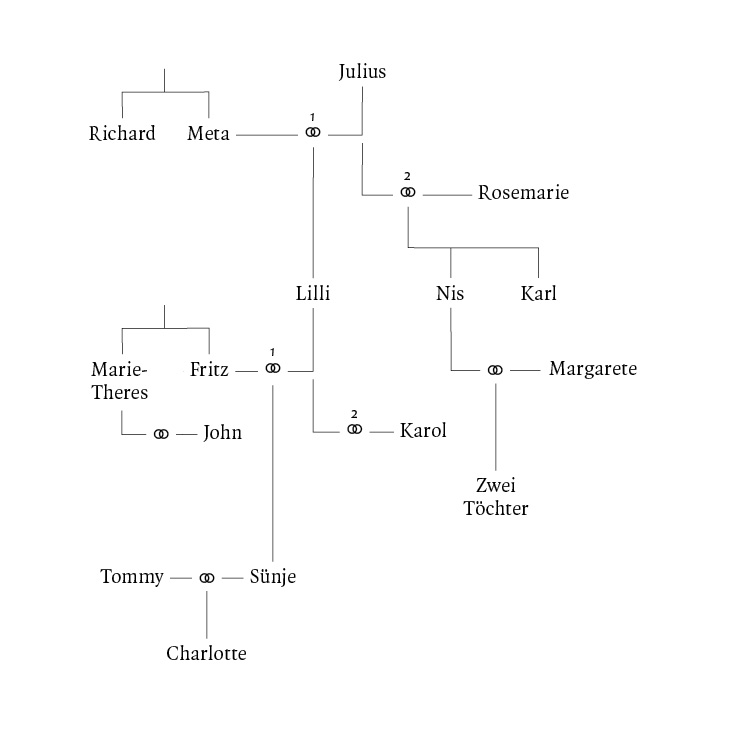 Über der Tür zeigt ein Löwenkopf seinen Rachen. Der Karl hält sich an der Hand der Lilli fest, und die geht mit ihm die Treppe hoch, in einen großen Raum, wo sie warten, bis aus einer anderen Ecke eine der Frauen mit weißer Schürze herbeieilt. «Wir haben weniger Bedienstete jetzt», meint die Lilli, «sonst hätte hier jemand gewartet, statt dass wir warten müssen, bis die Friede durch den Dienstboteneingang angewackelt kommt, und Onkel Richard müsste auch mein Auto nicht selbst in die Garage fahren.»